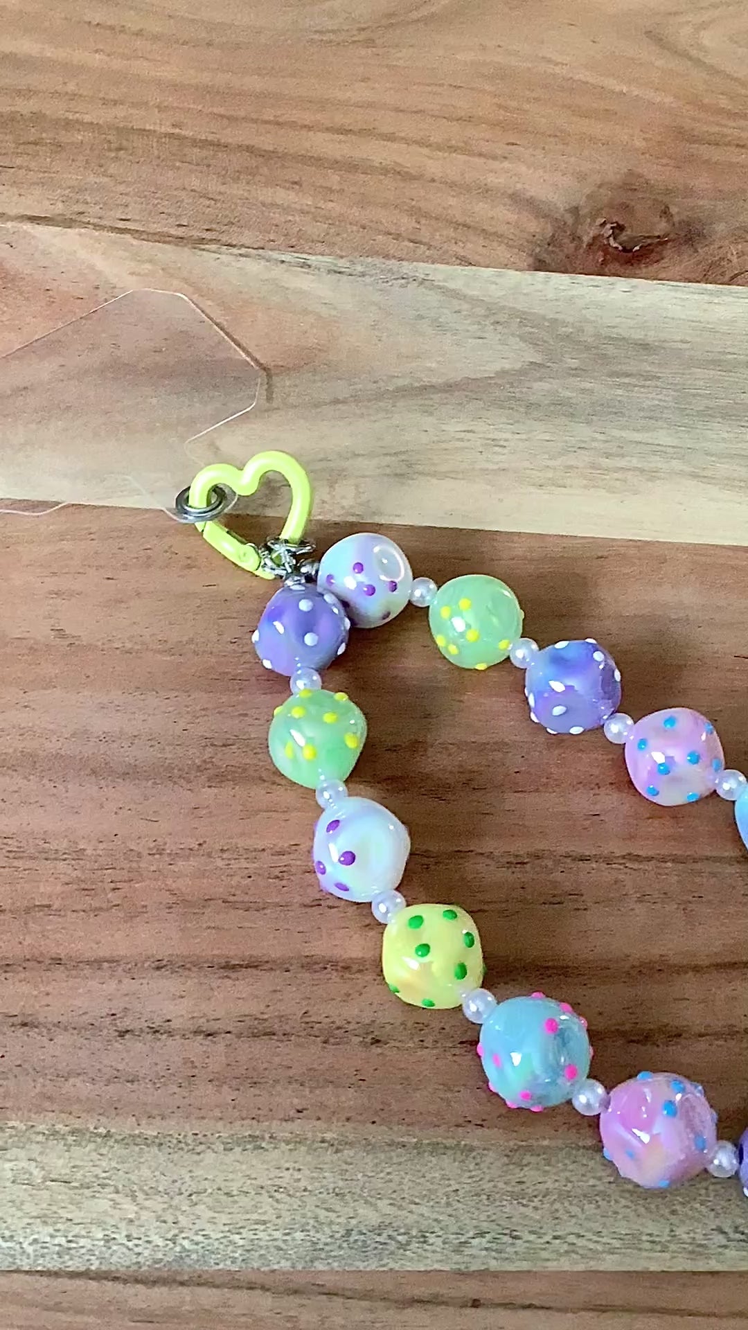 "Add a pop of color and fun to your phone with these playful Acrylic Polka-Happy-Dots Wristlet! Featuring pastel iridescent beads and bright raised dots, this wristlet comes with a heart-shaped carabiner and clear tether for easy attachment. Never lose or drop your phone again!"