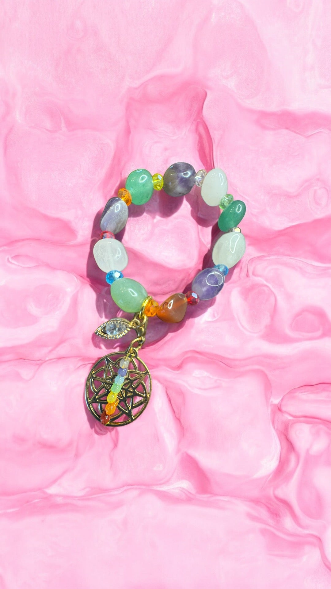 Featuring dyed quartz nuggets and faceted bicones in soothing colors, this Chakra Stretch Bracelet includes a gold toned chakra charm and evil eye protector. Each bracelet is made to order, ensuring a perfect fit and promoting balance and calming energy.